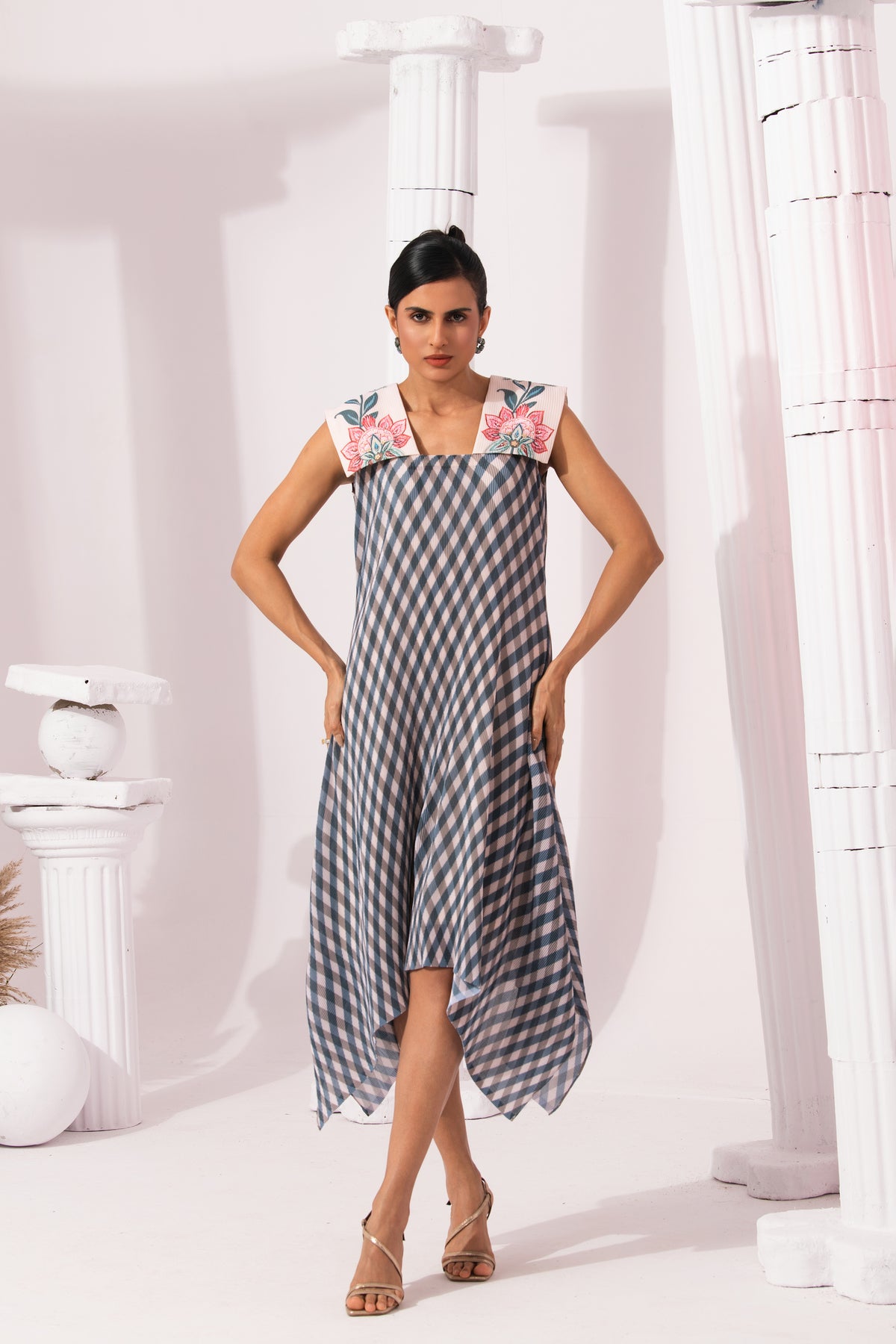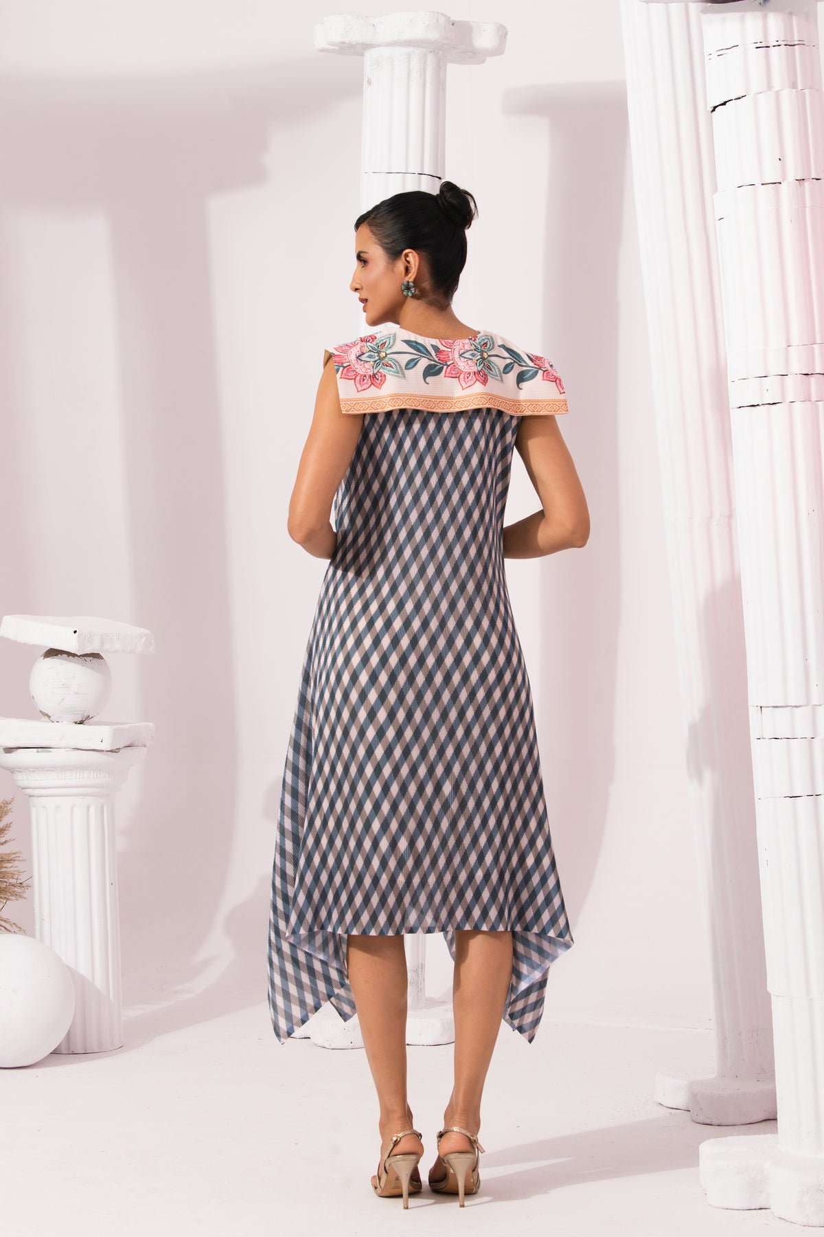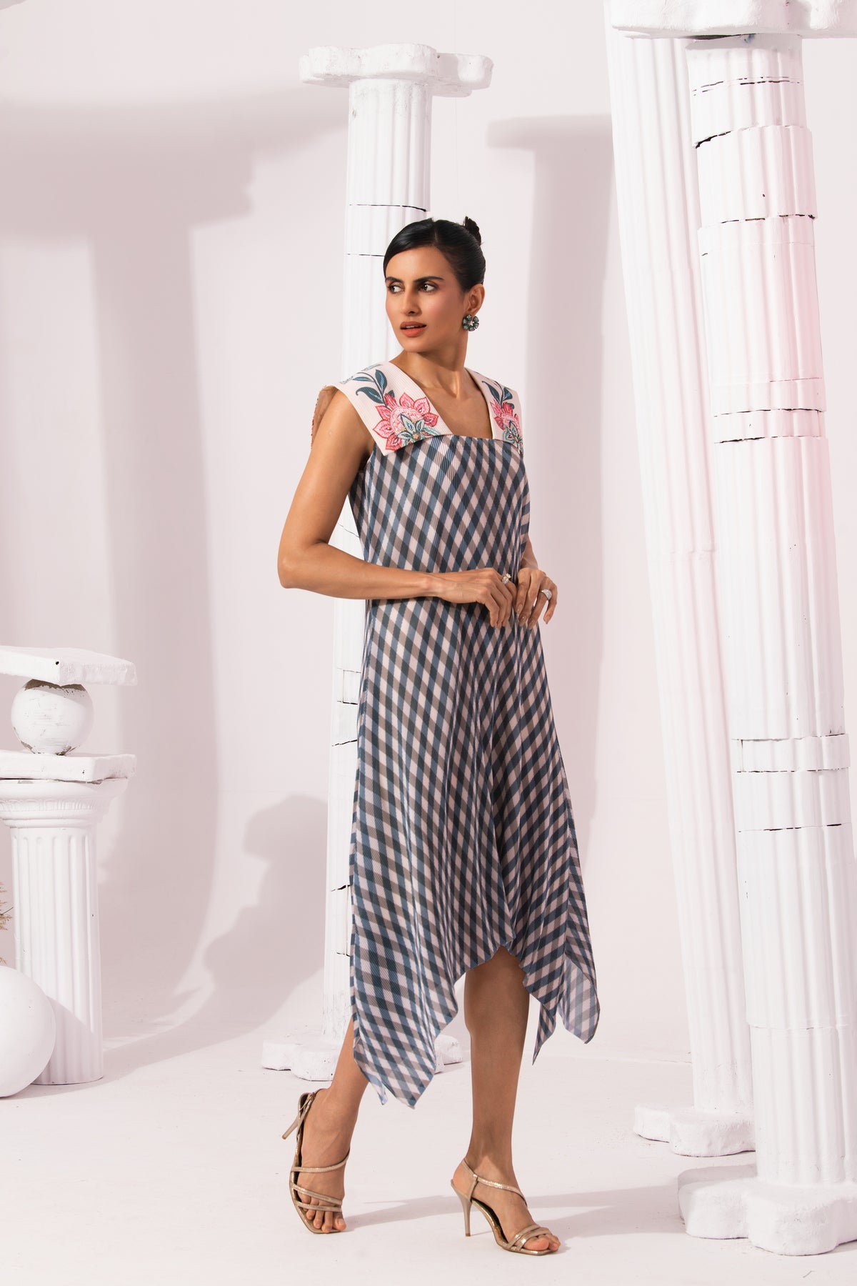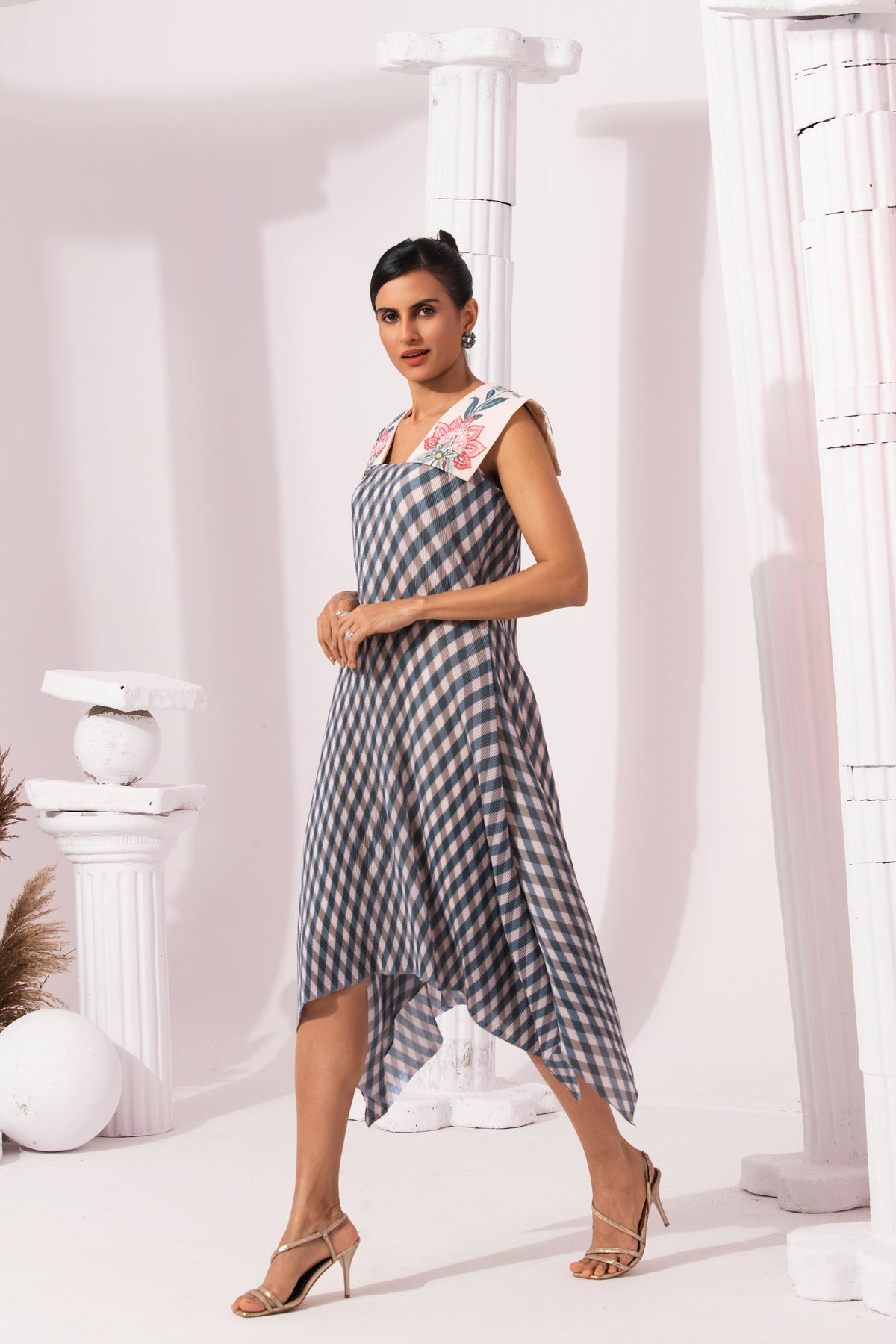 CLASSIC BLUE CHECKS DRESS WITH WIDE SQUARE COLLER