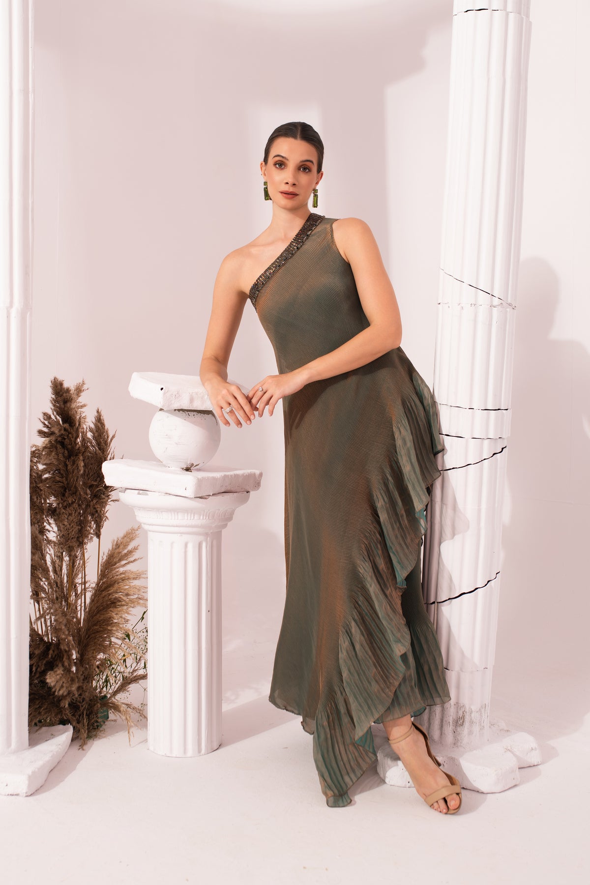 METALIC MOSS GREEN ONE SHOULDER DRESS