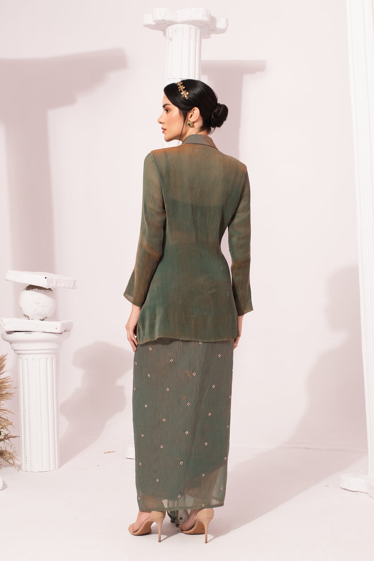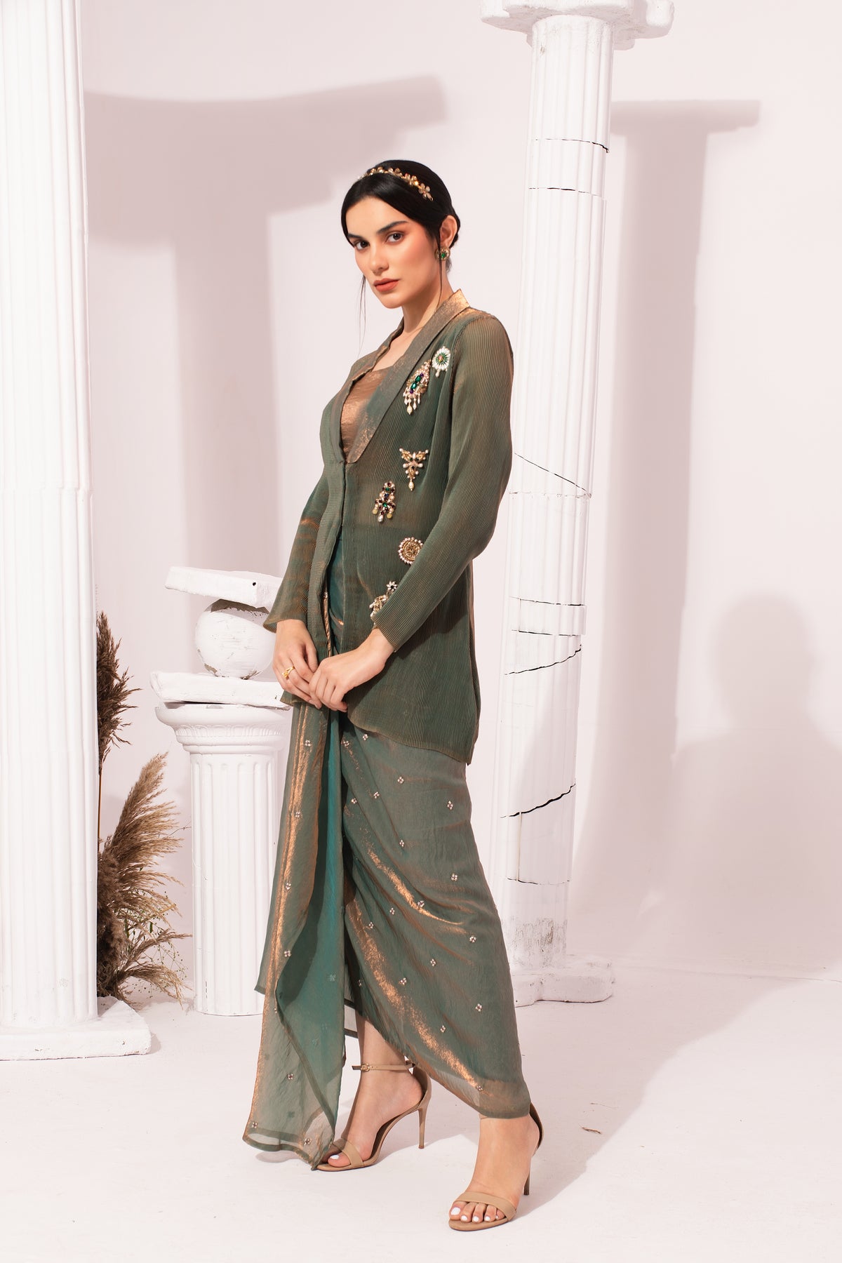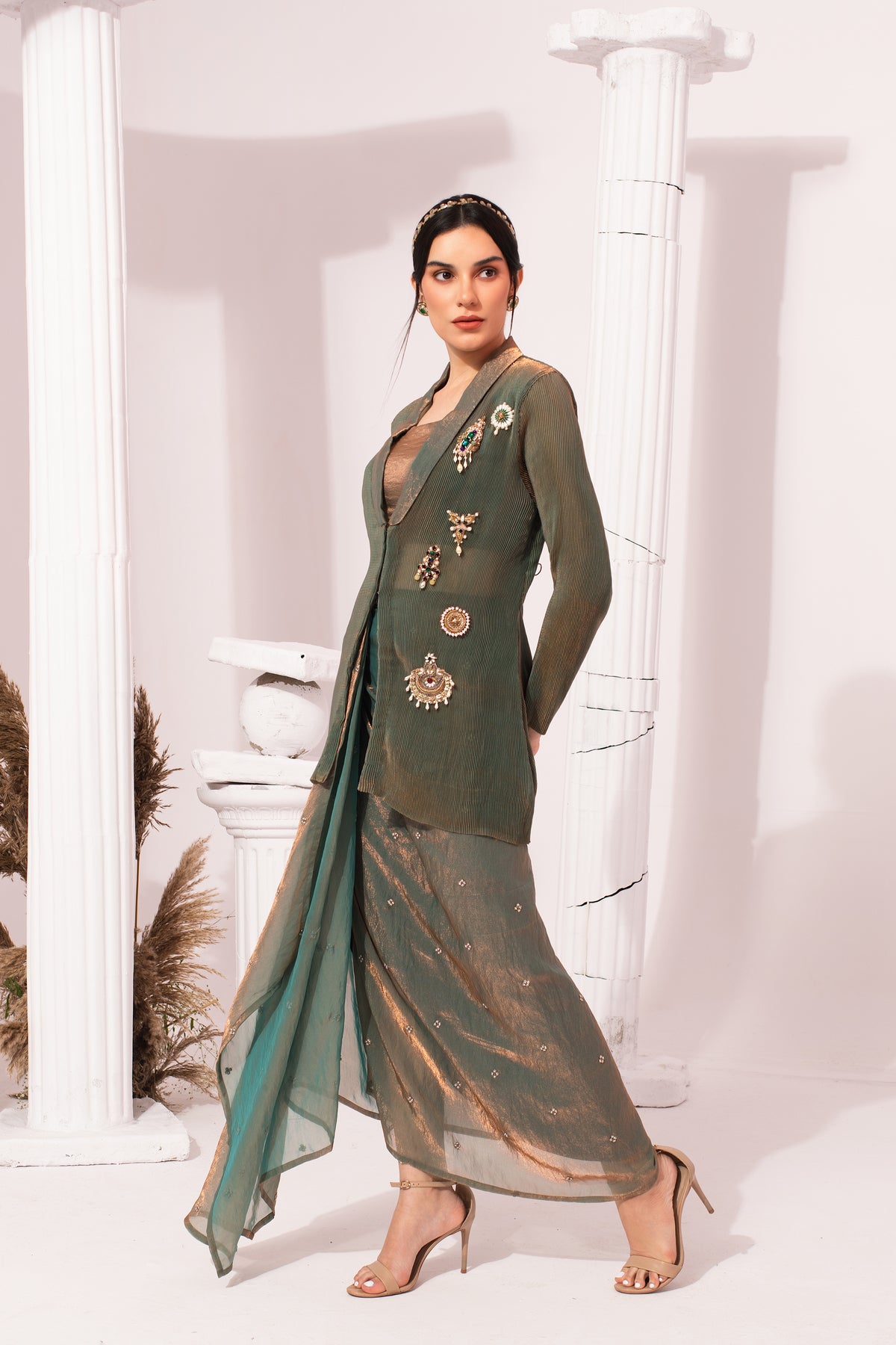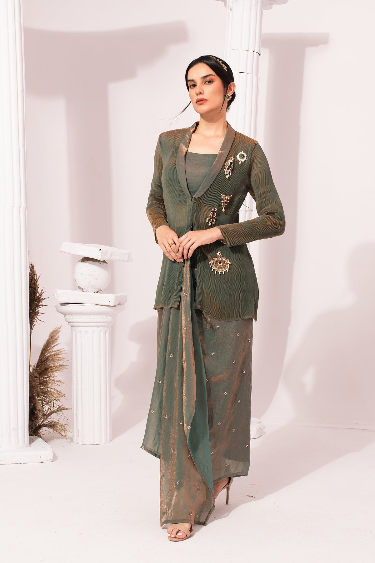 Featuring a micro pleated two tone tissue satin jacket paired with drape dhoti set. Intricate hand crafted embroidery on jacket , perfectly balance modern with traditional look .