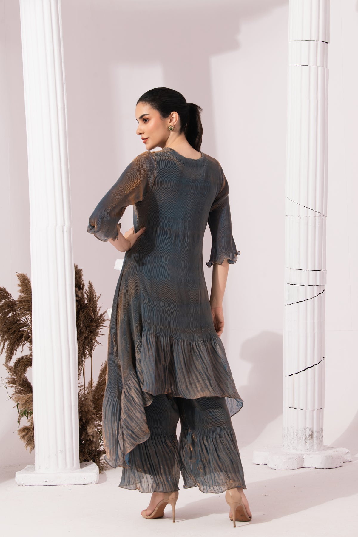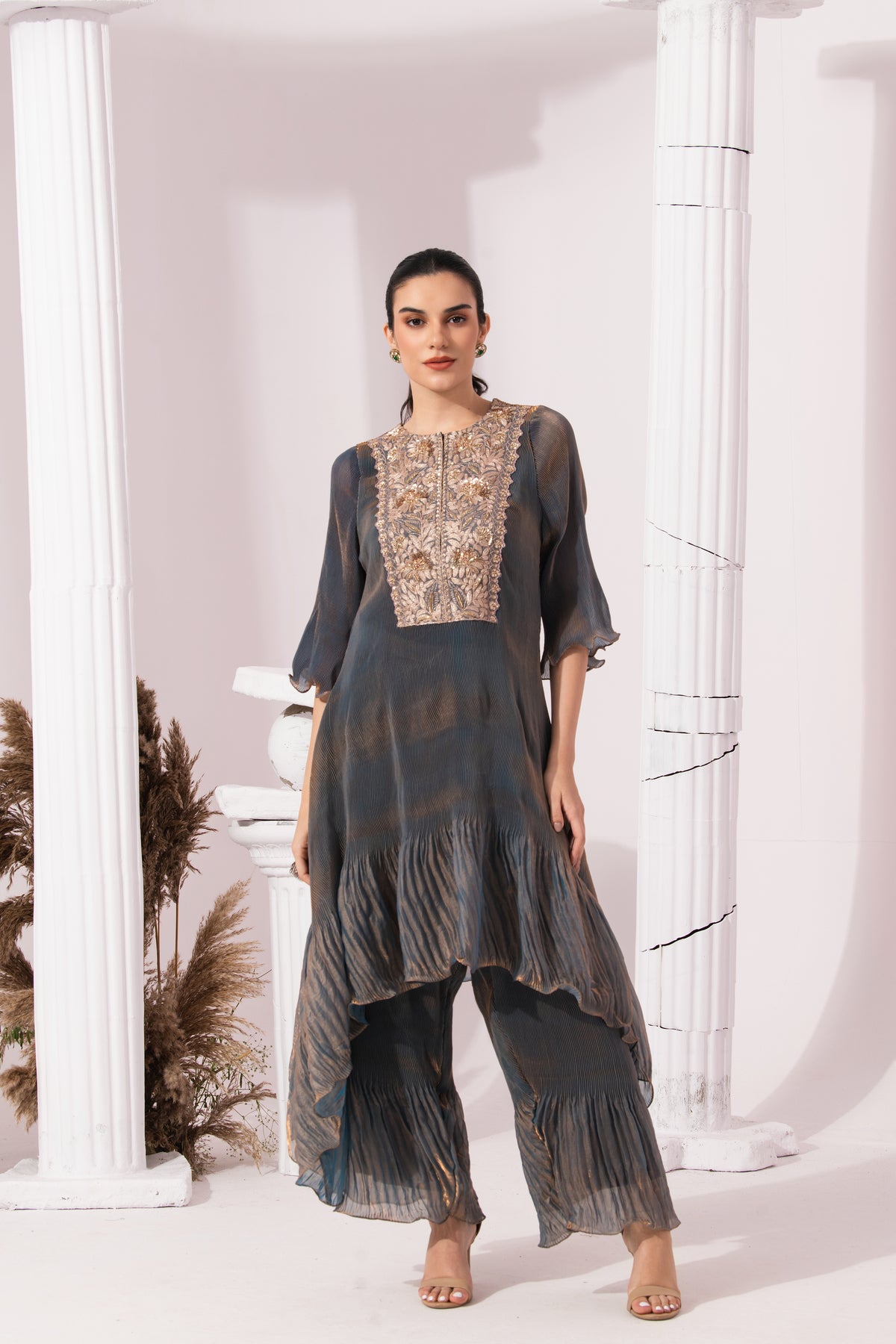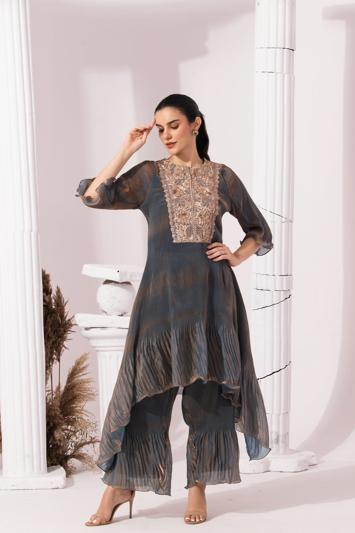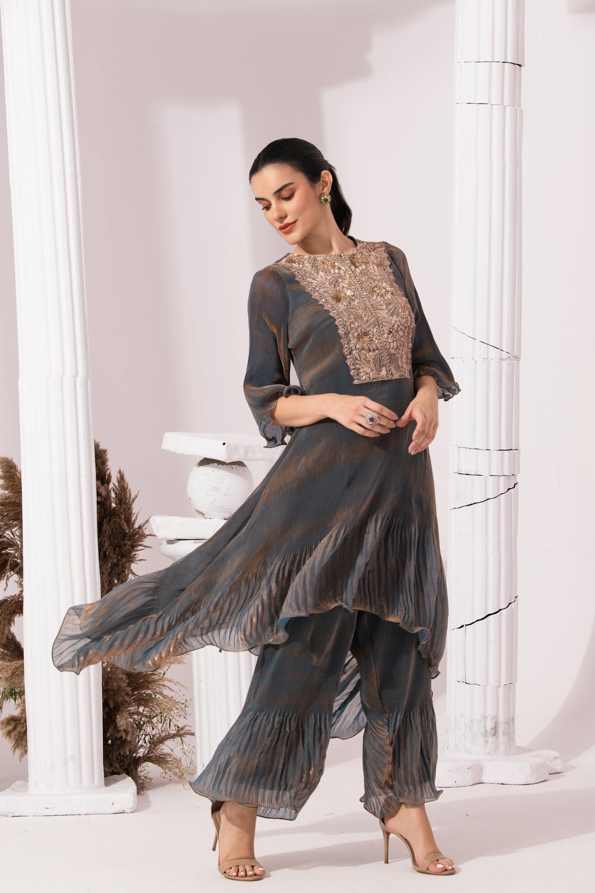 Featuring a micro pleated two tone tissue satin kurta paired with sharara pant set. Intricate hand crafted embroidery on kurta, perfectly balance modern with traditional look .