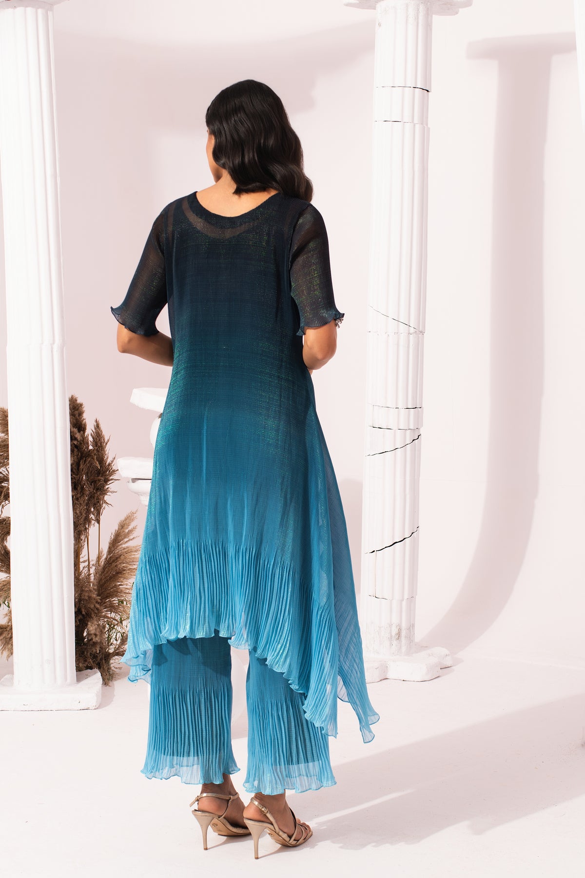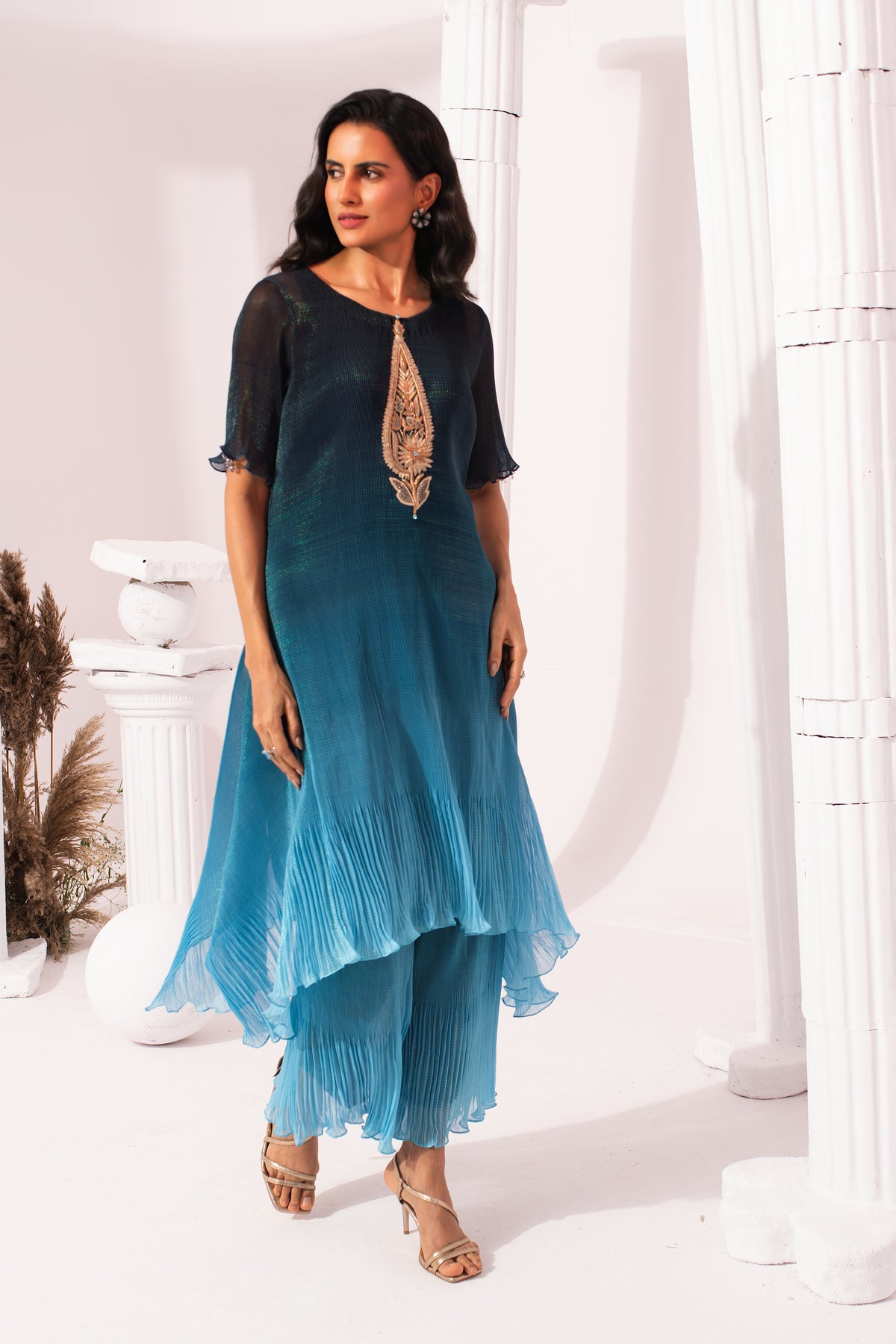 Featuring a micro pleated chiffon kurta  paired with pant set. Intricate hand crafted embroidery on kaftan, perfectly balance modern with traditional look .