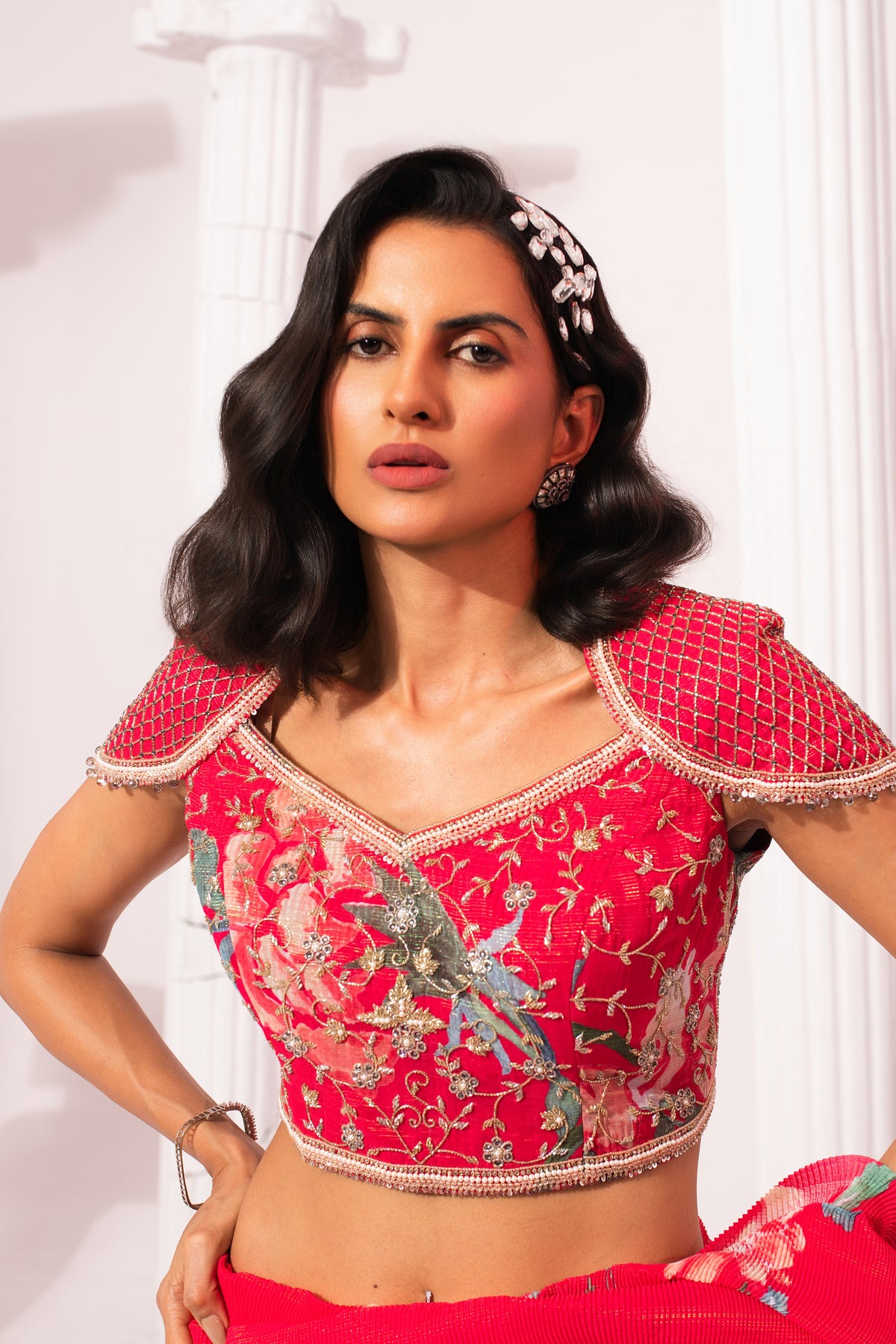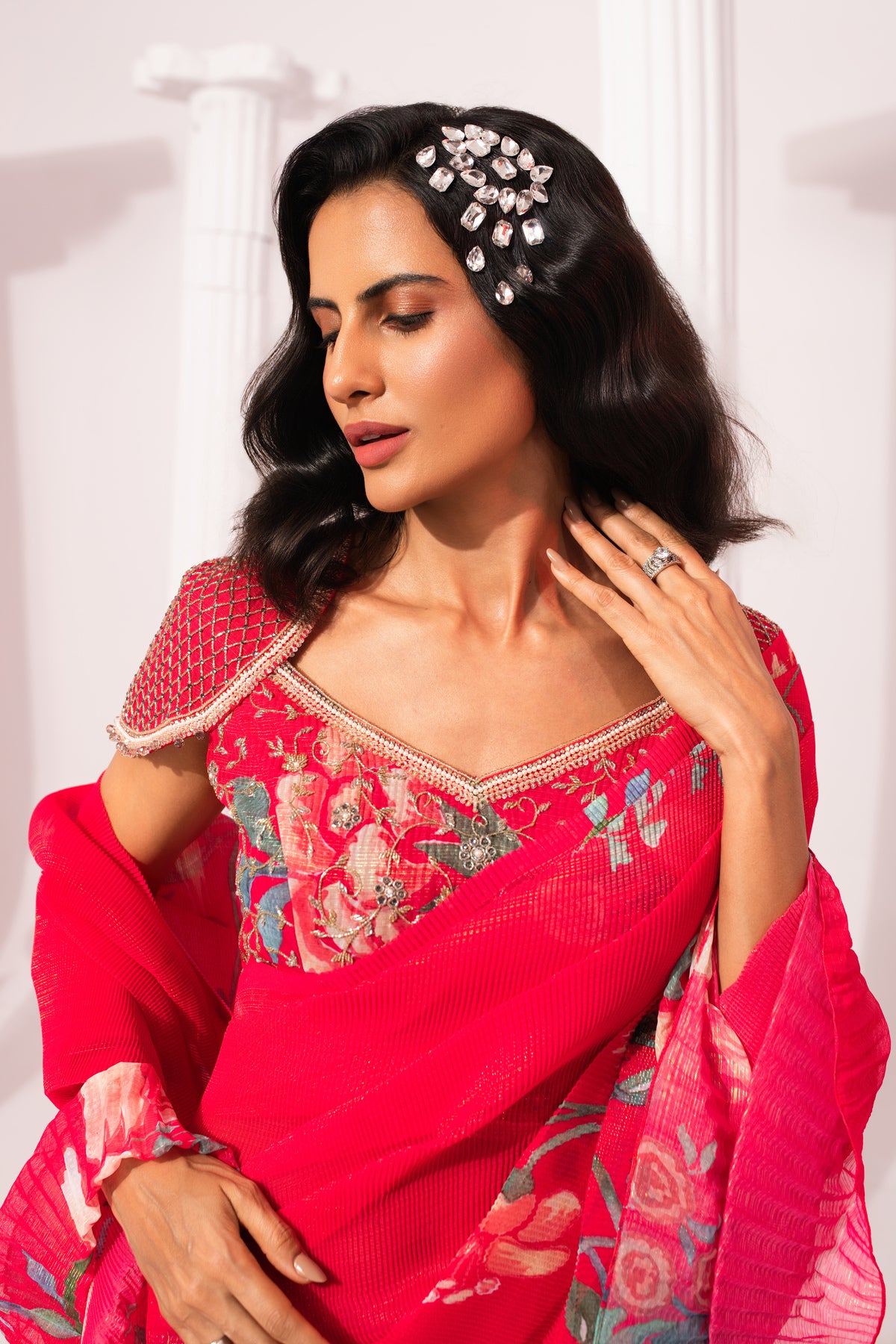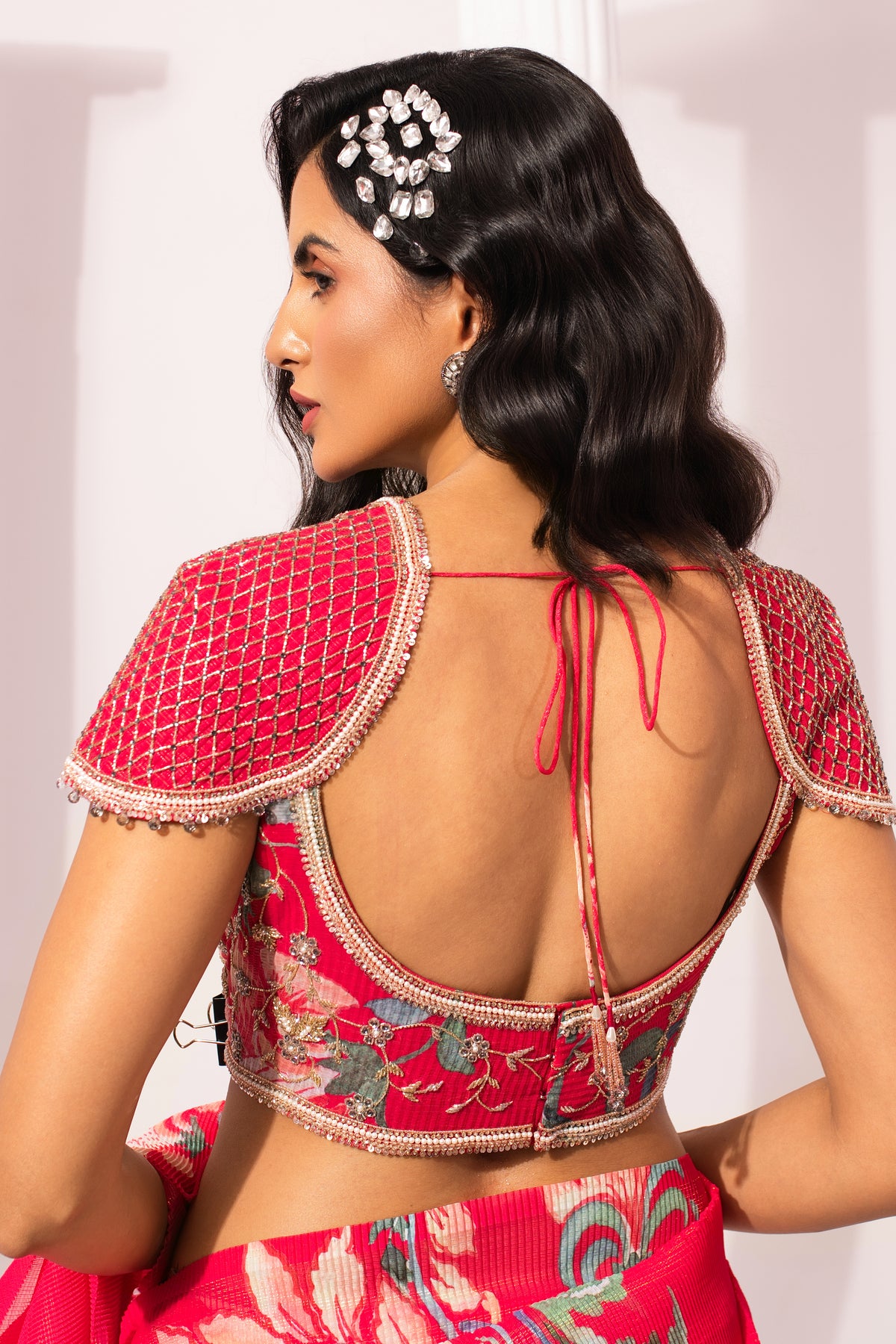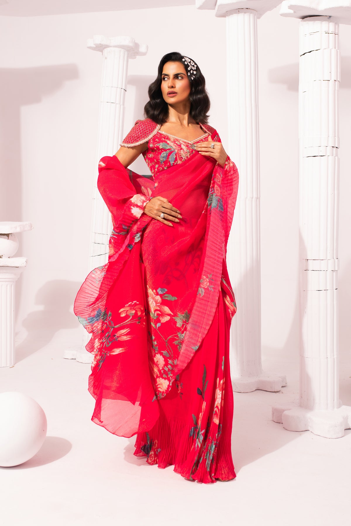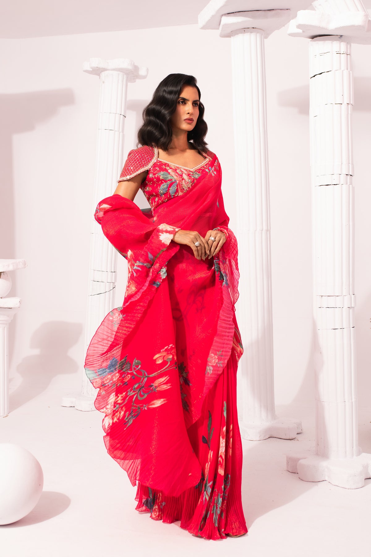 Featuring a micro pleated Hand-painted digitally trannsferred print georget pre-draped saree . Intricate hand crafted embroidery on blouse , perfectly balance modern with traditional look .