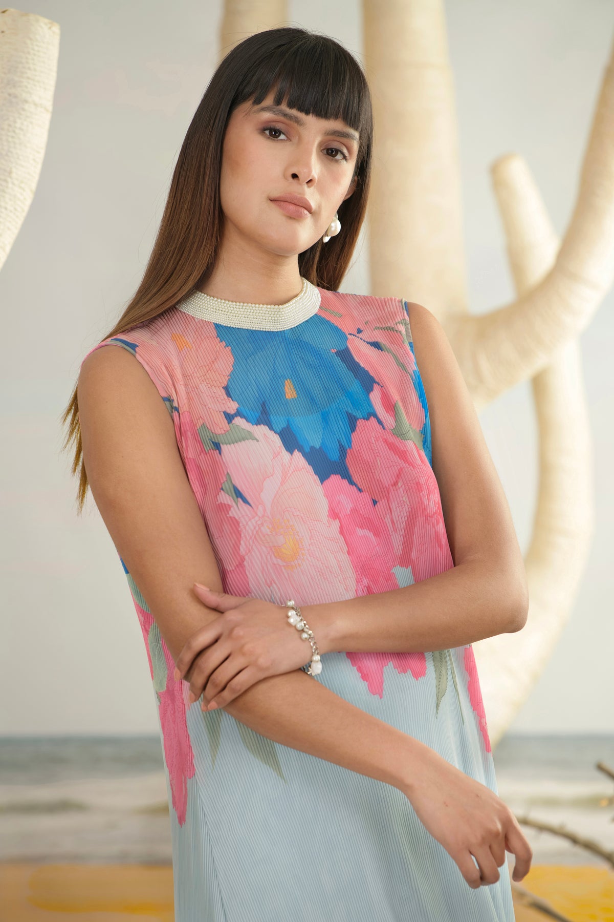 AQUA BLUE DIGITAL PRINT STAND COLLER KURTA SET