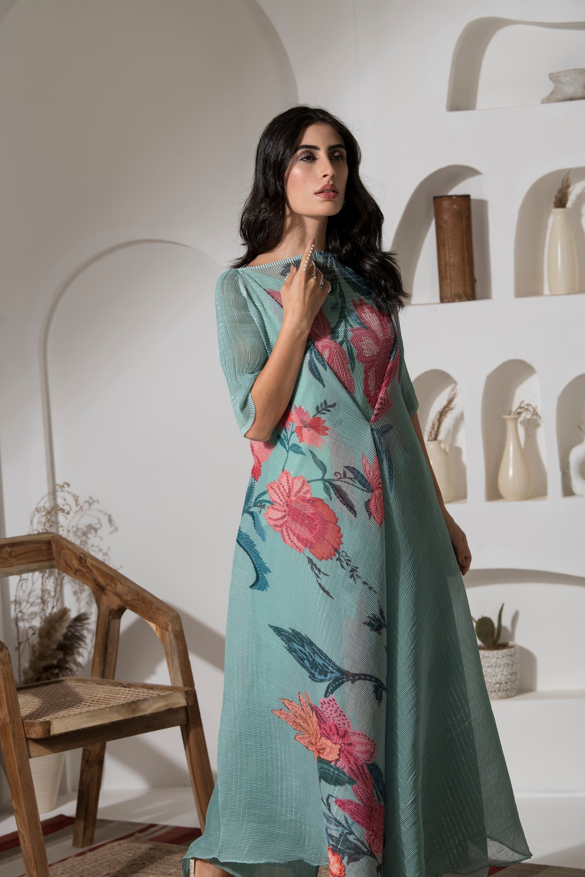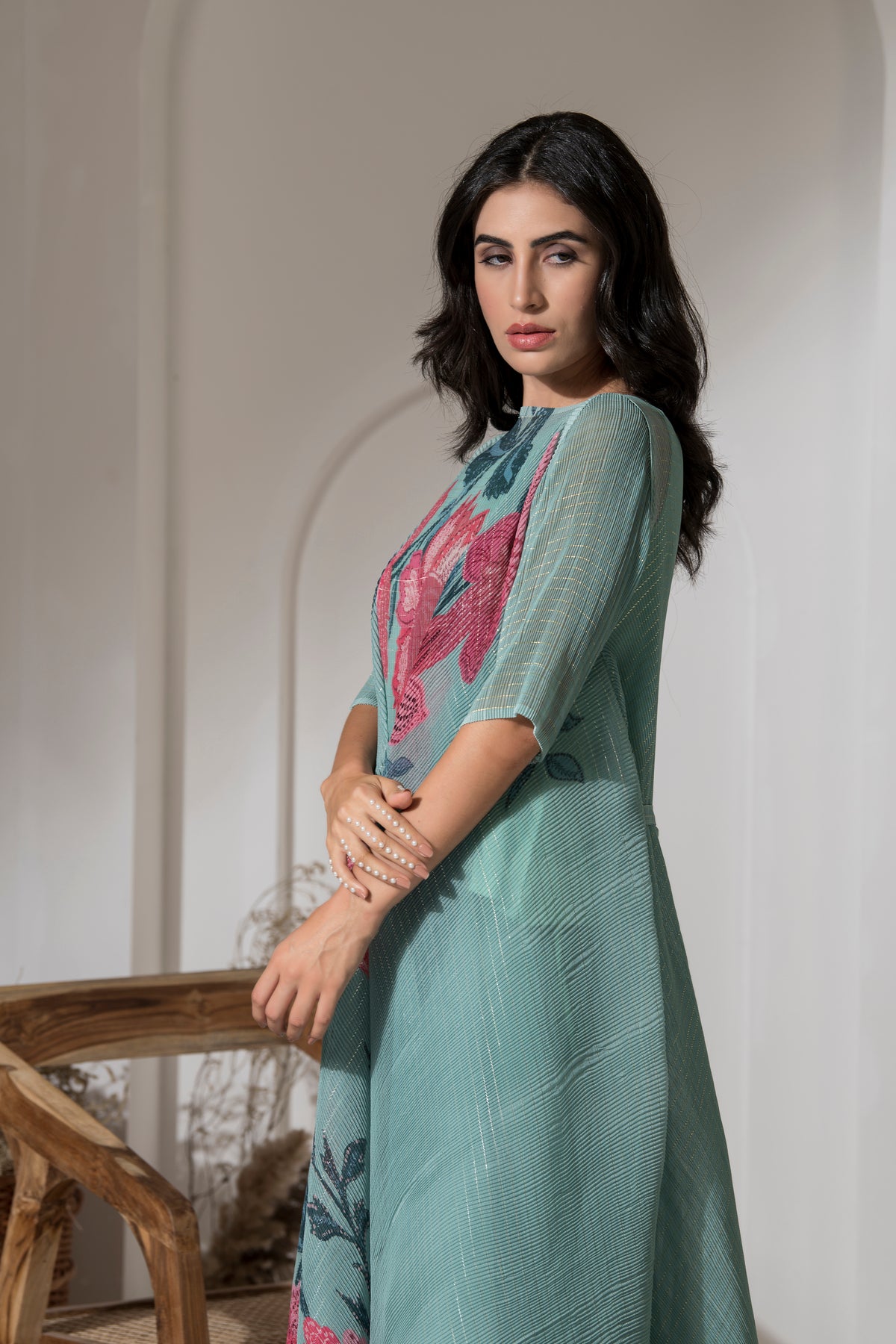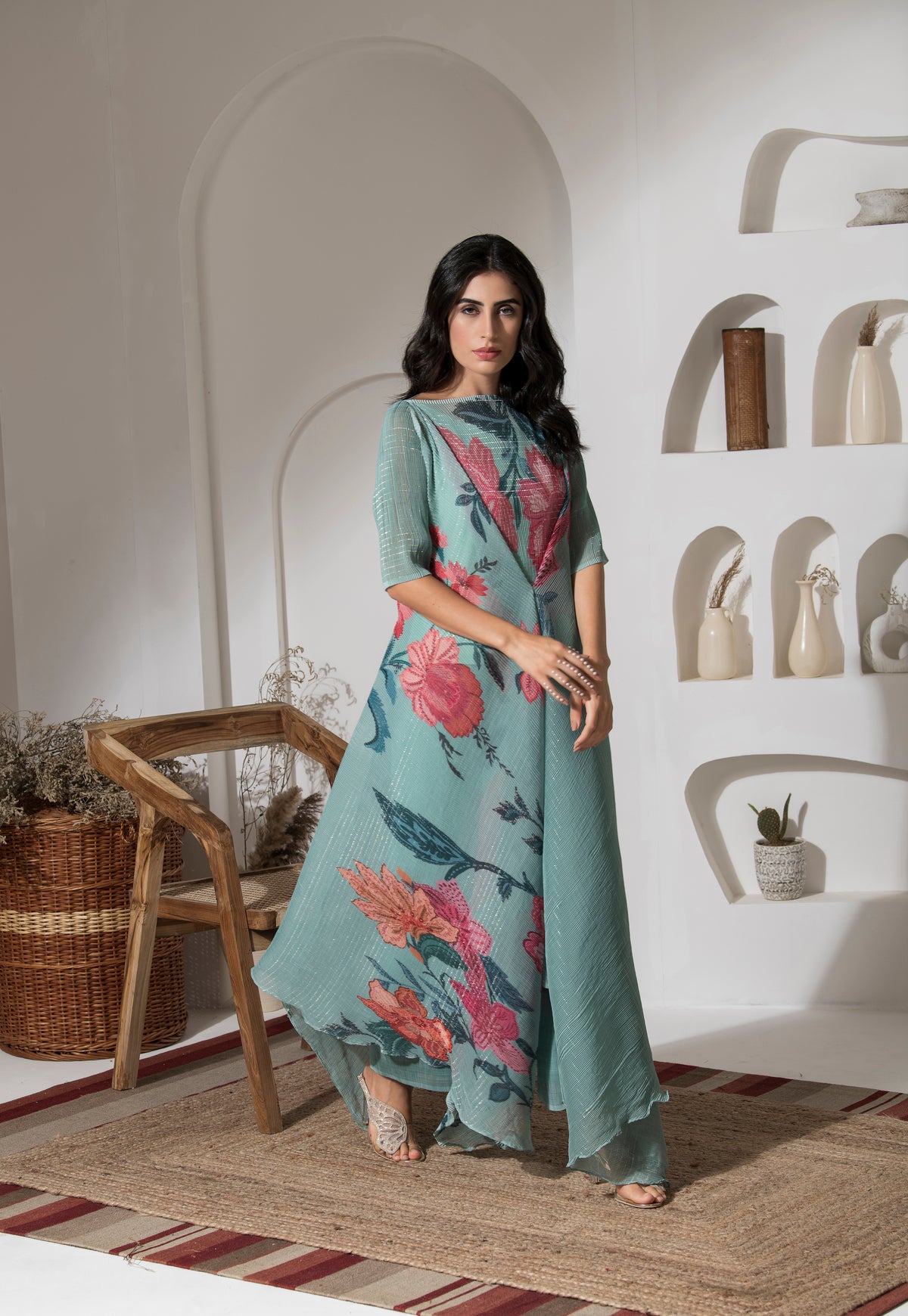 DUSTY JADE GREEN FLOWER PRINT PLEATED CO-ORD SET