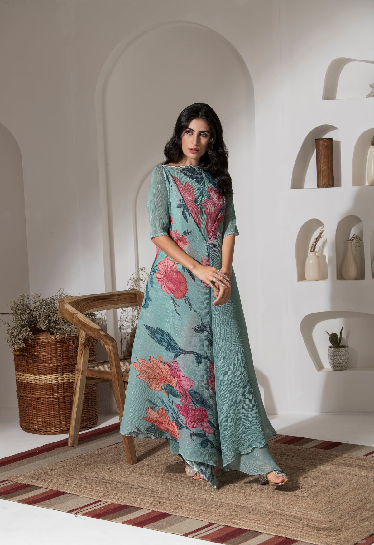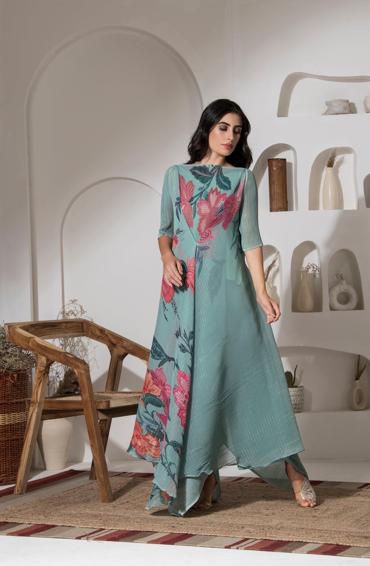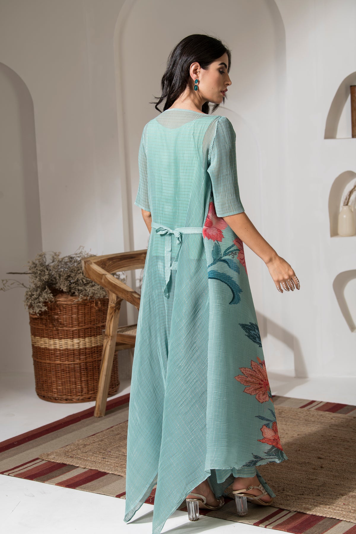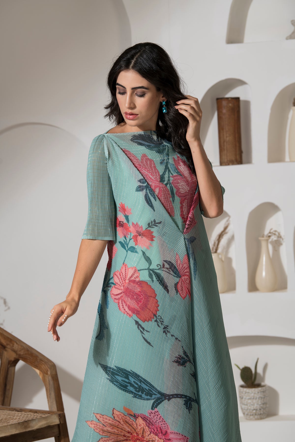 DUSTY JADE GREEN FLOWER PRINT PLEATED CO-ORD SET