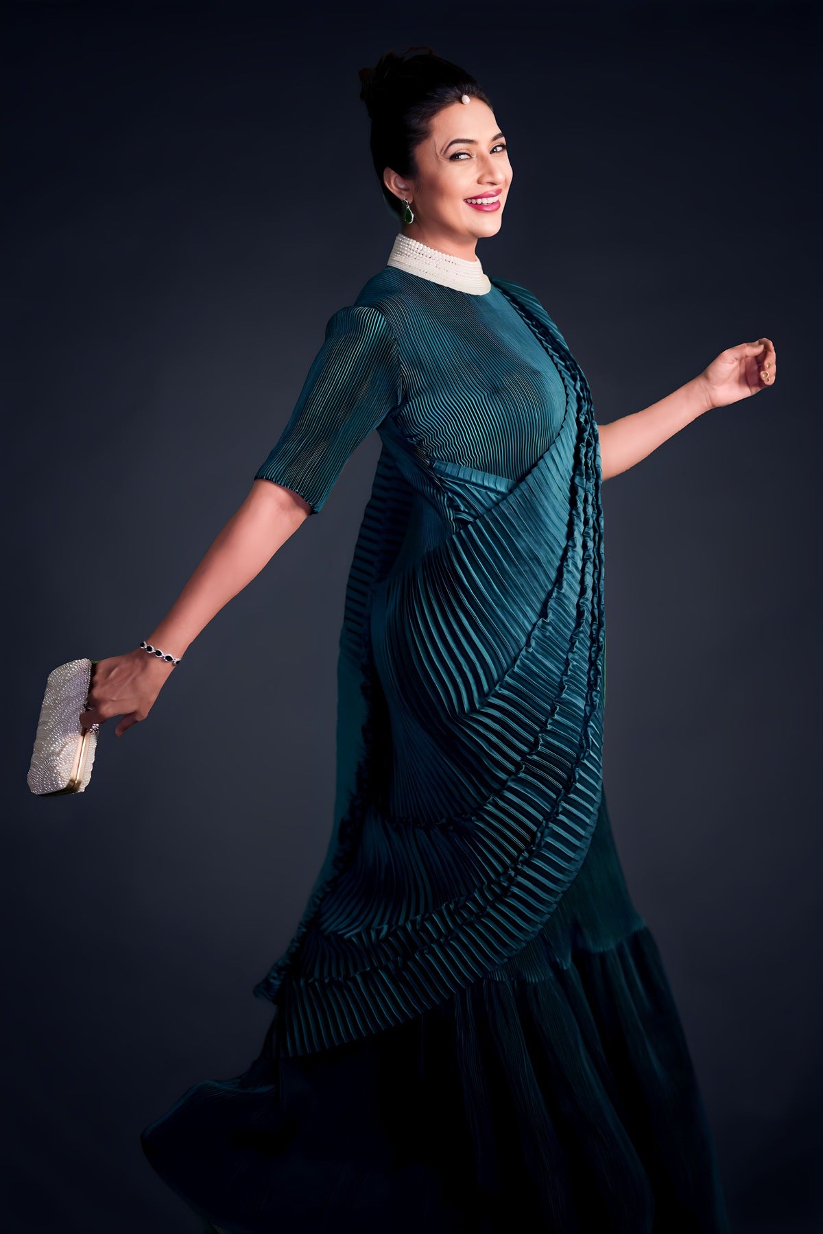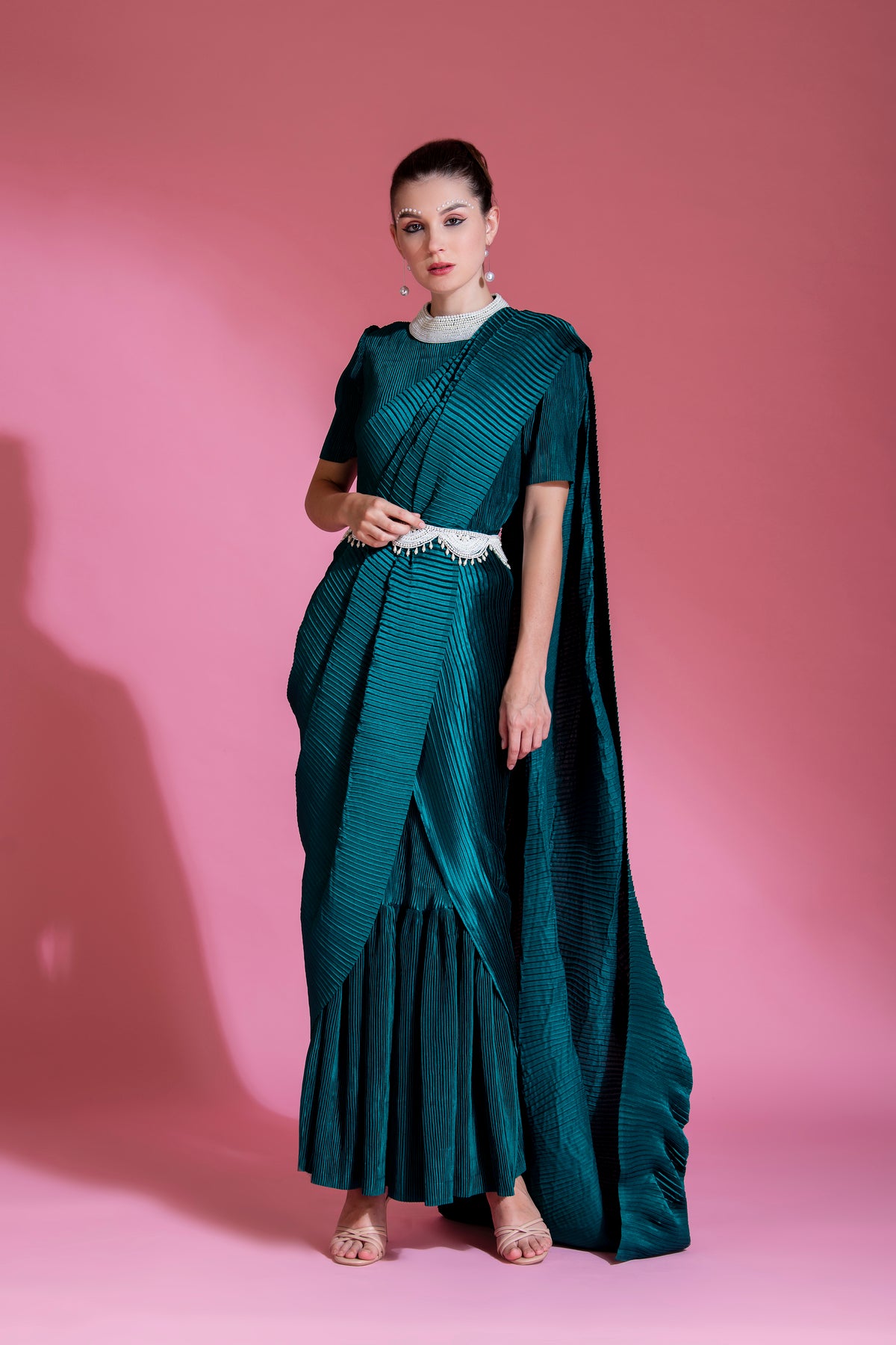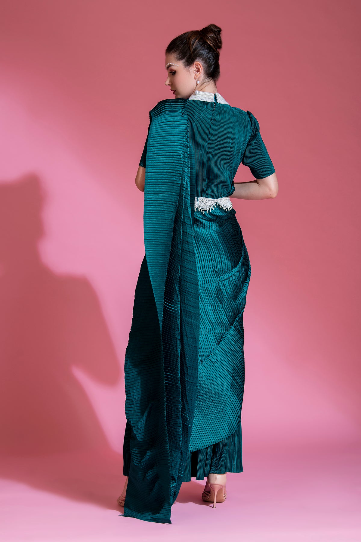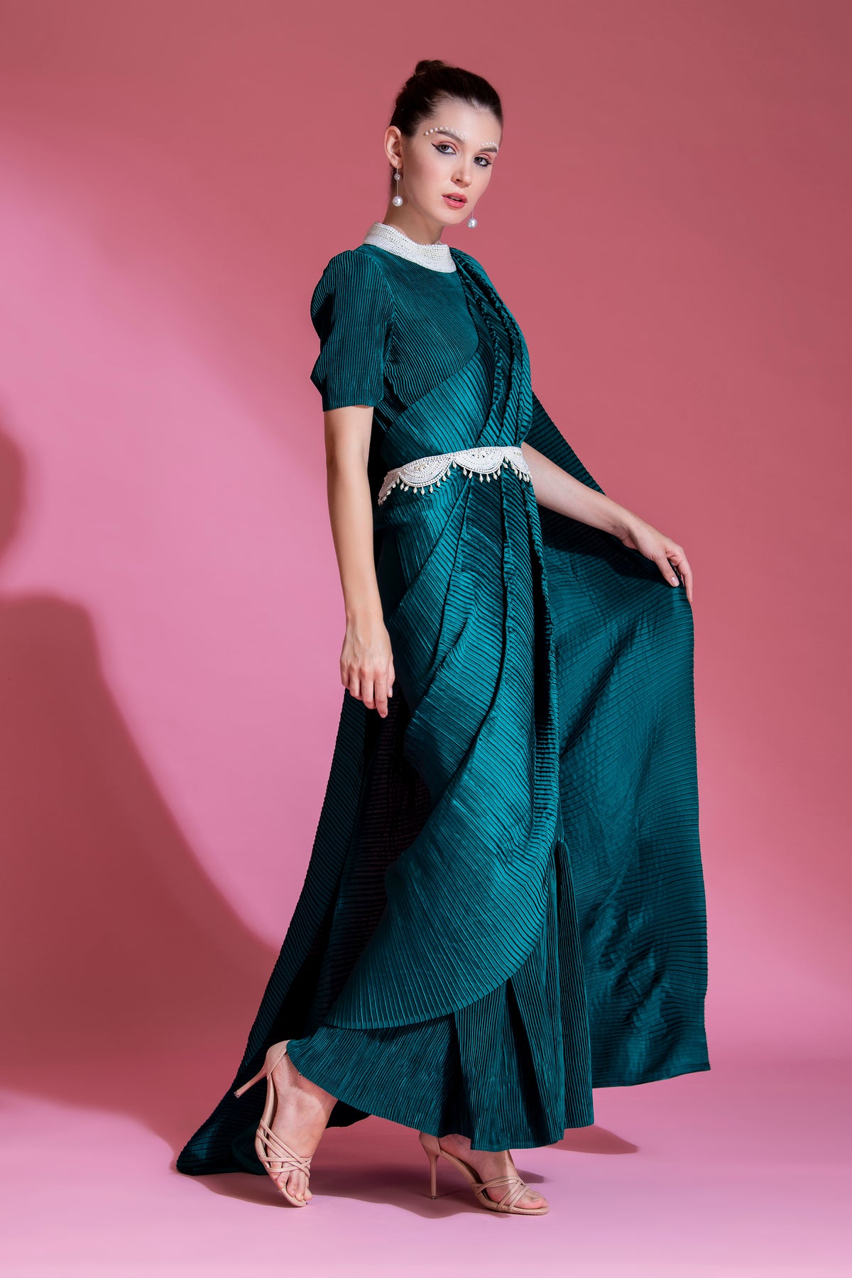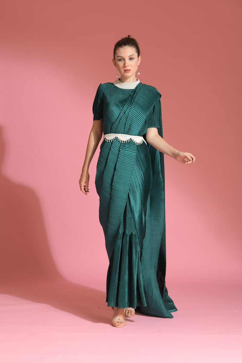 GREEN SAREE EMBRODED NECK BLOUSE WITH BELT