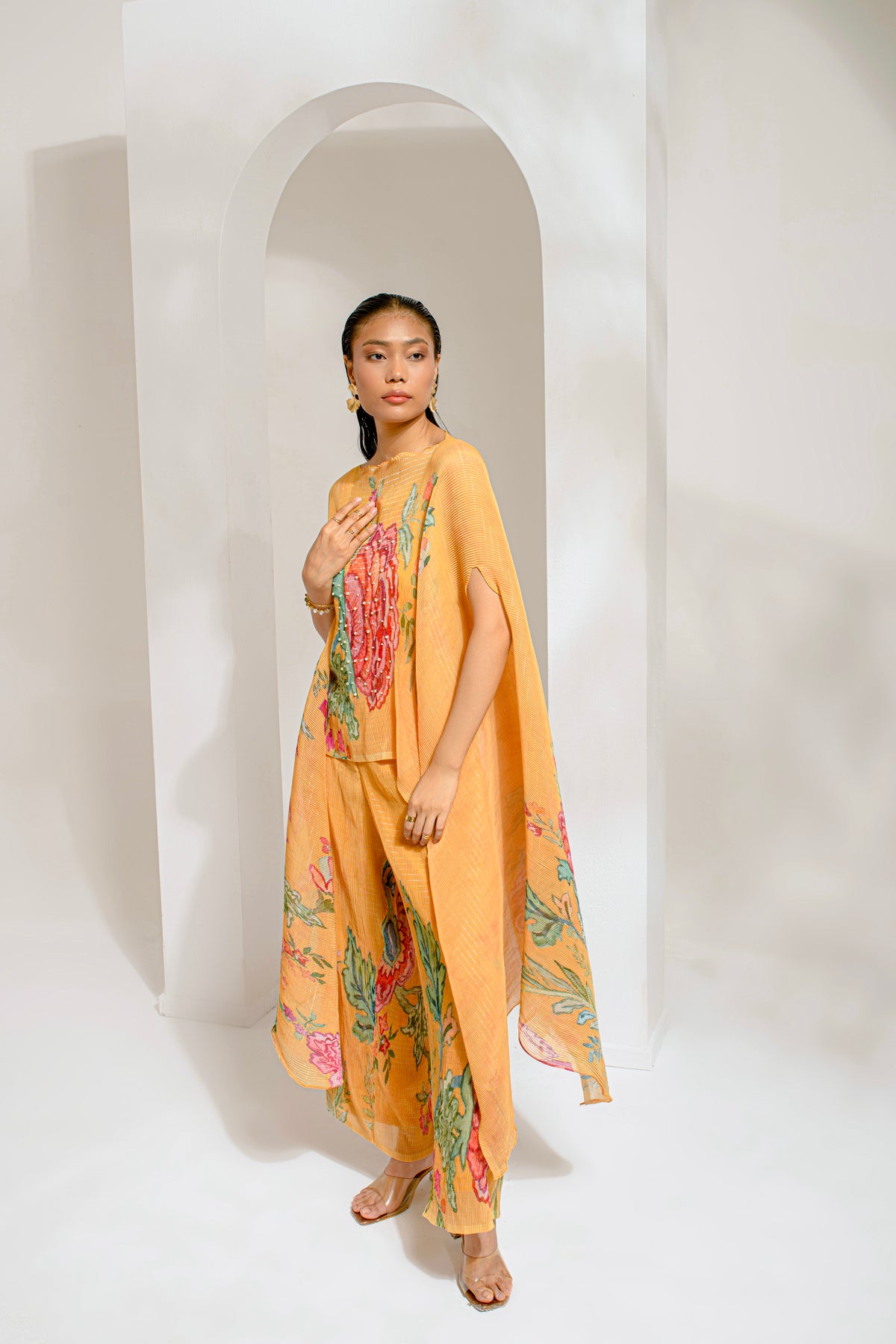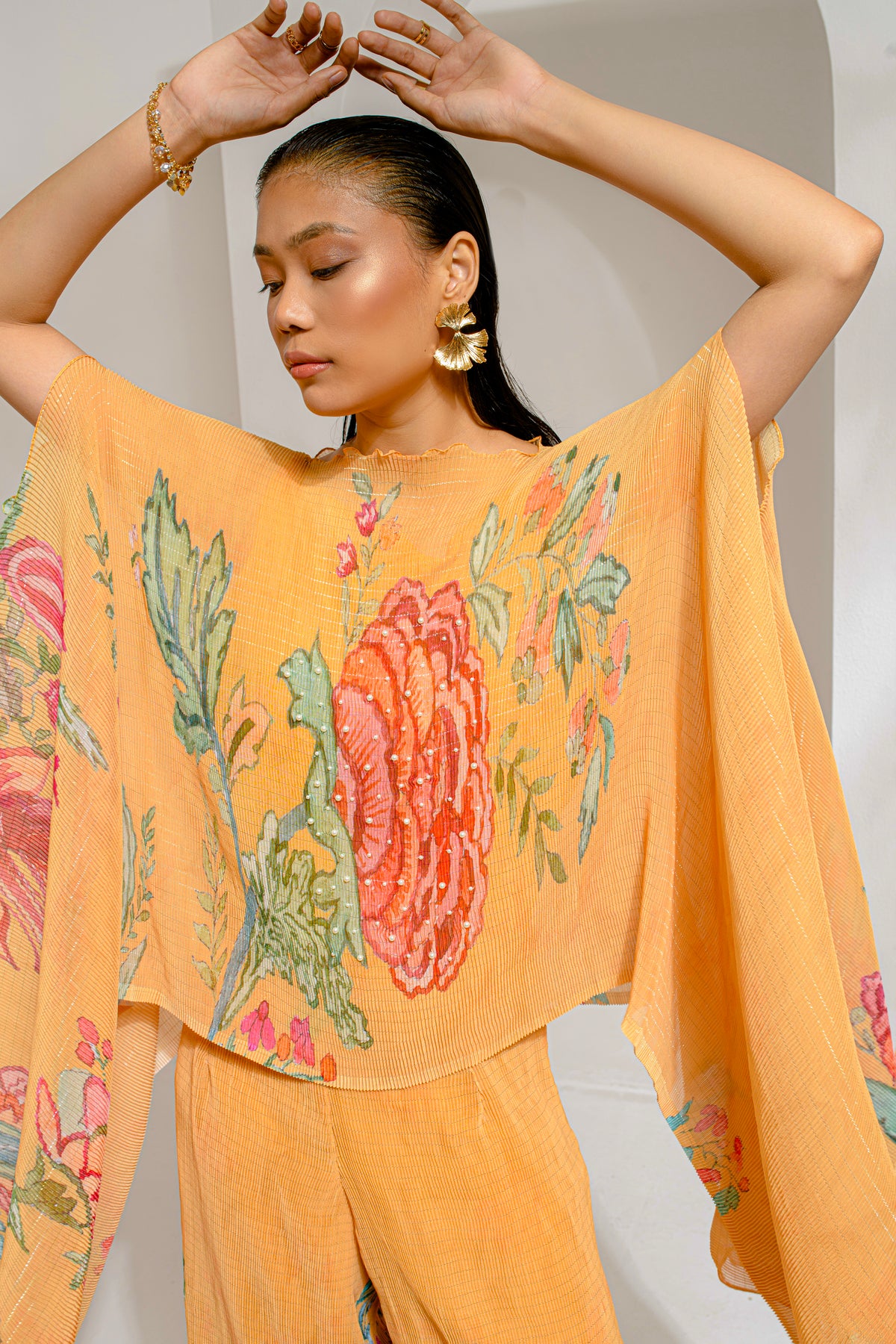 Featuring a Chrome Yellow Flower Kaftan with Pant Set.  It is paired with Hand-Embroidered Pearl work on Lurex Chiffon Fabric.