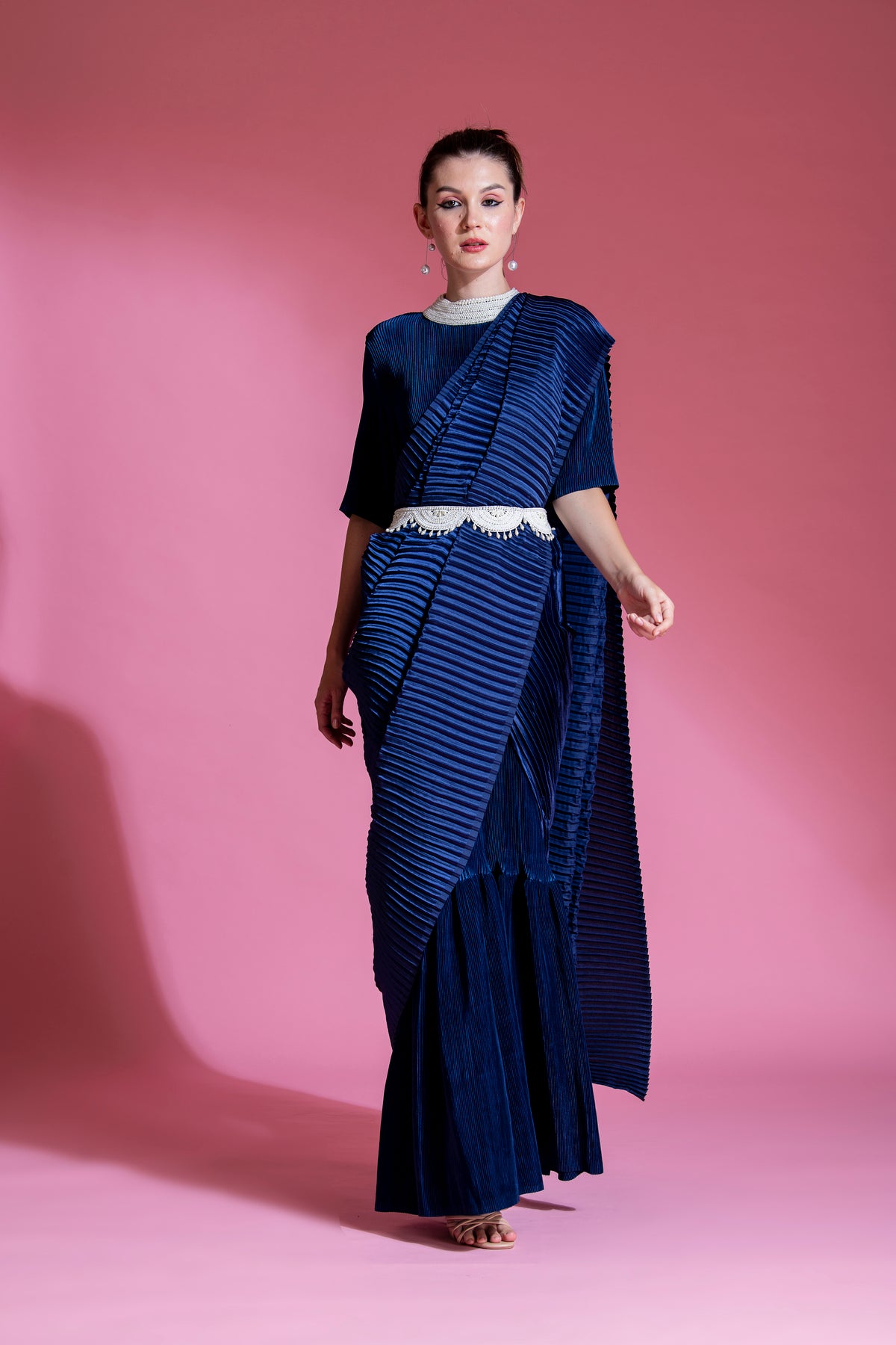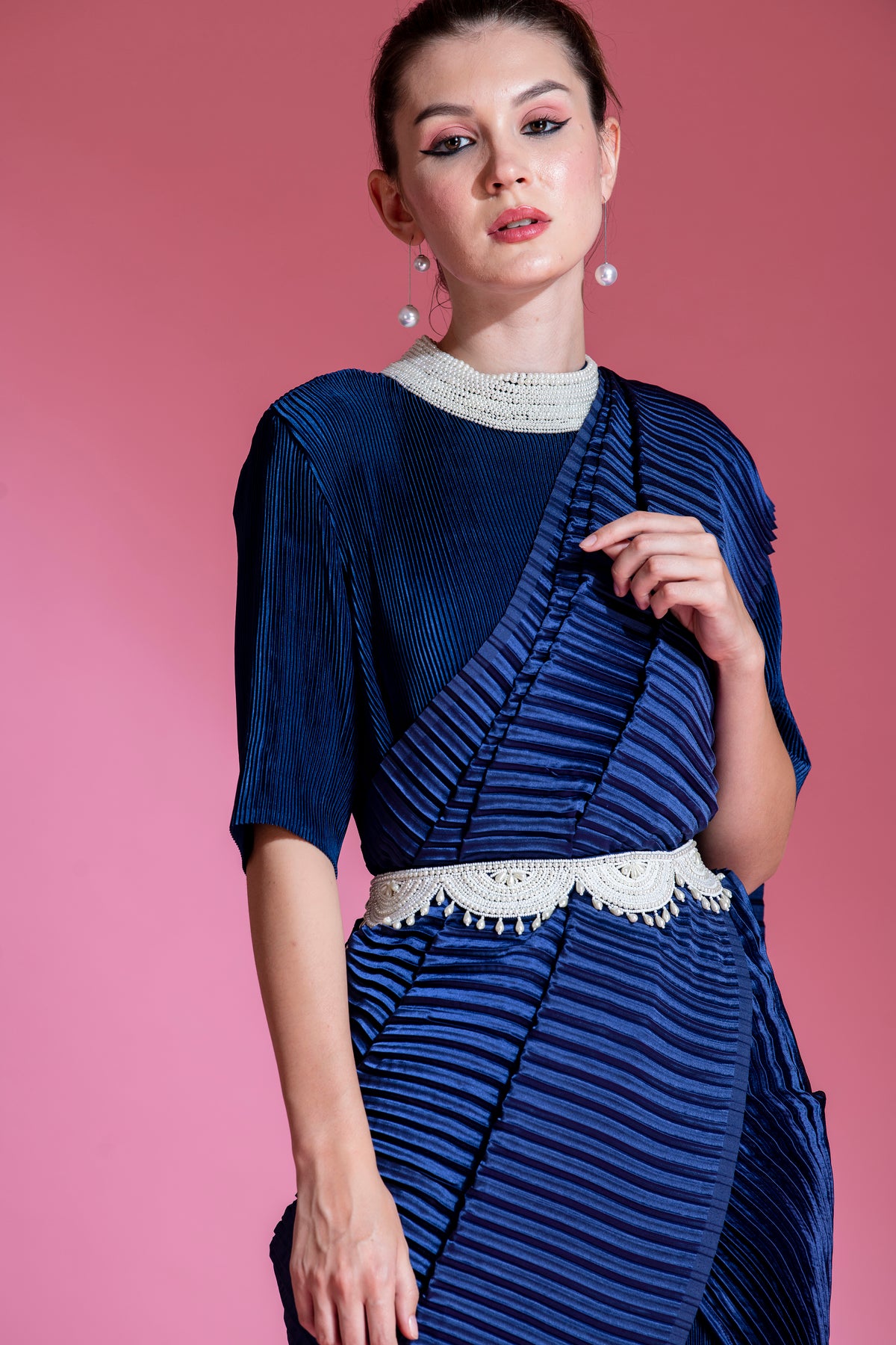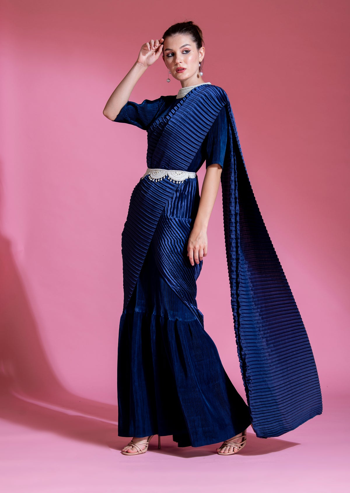 * Indico Blue Satin small pleated saree, with Big Pleated Pallu with Pearl  Handwork on Collar with belt.