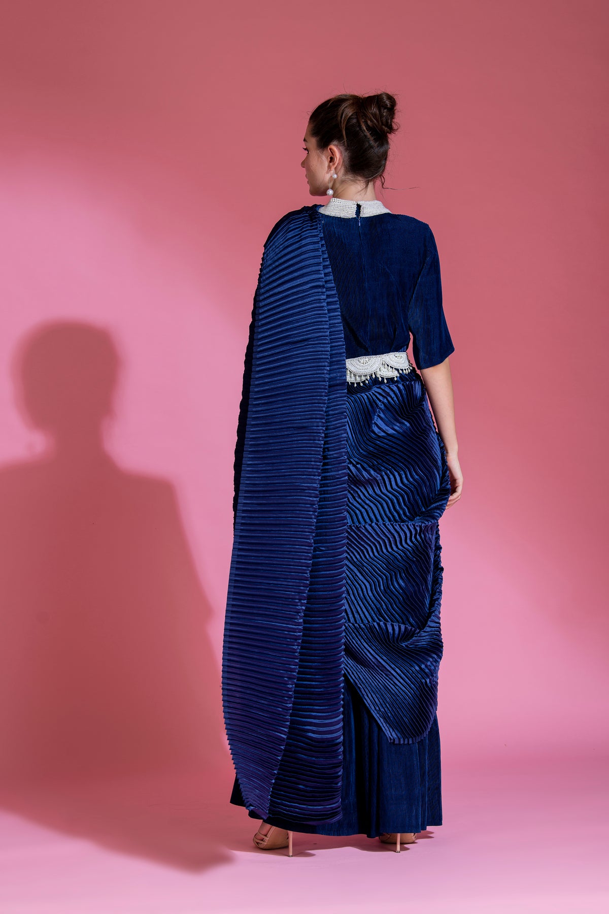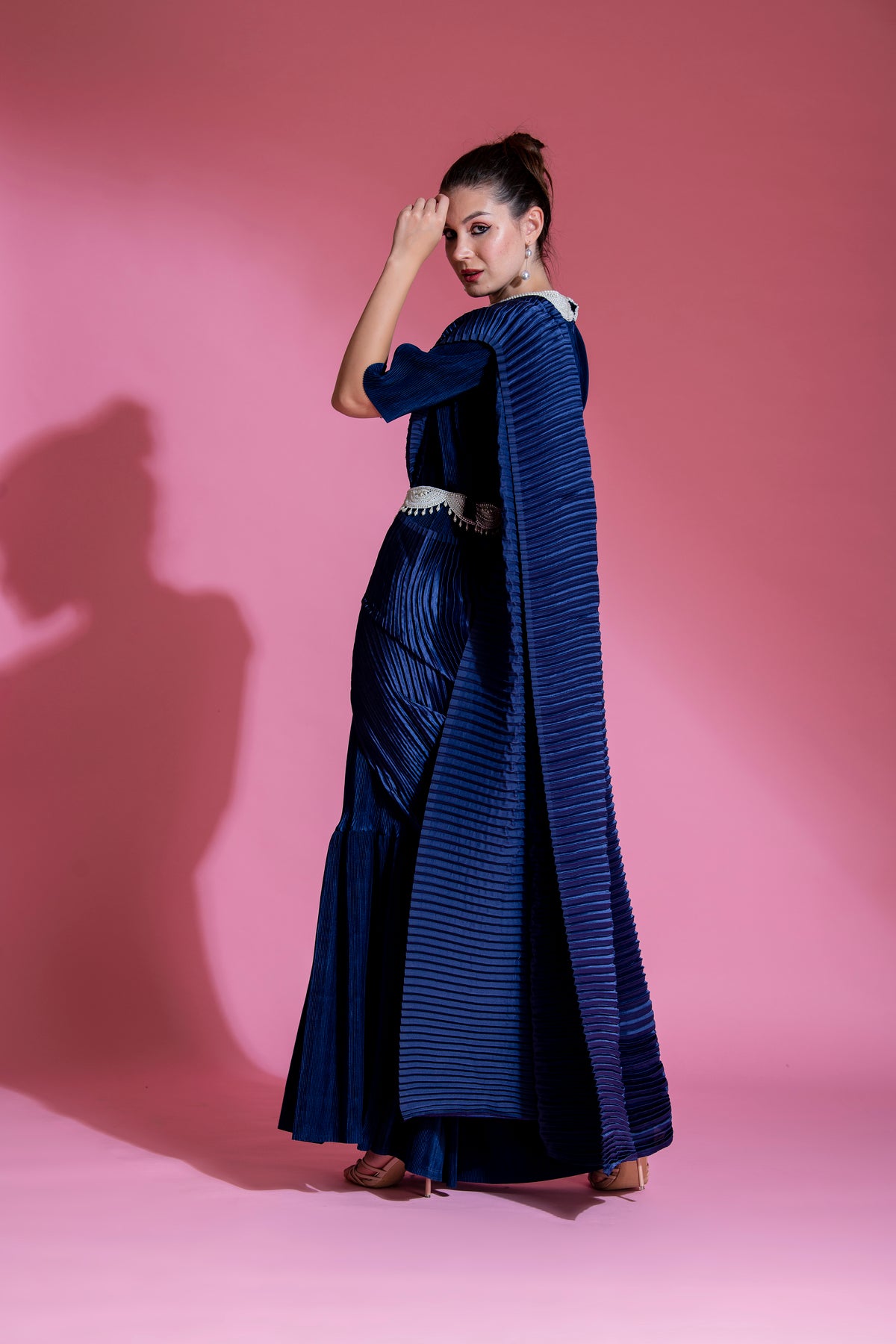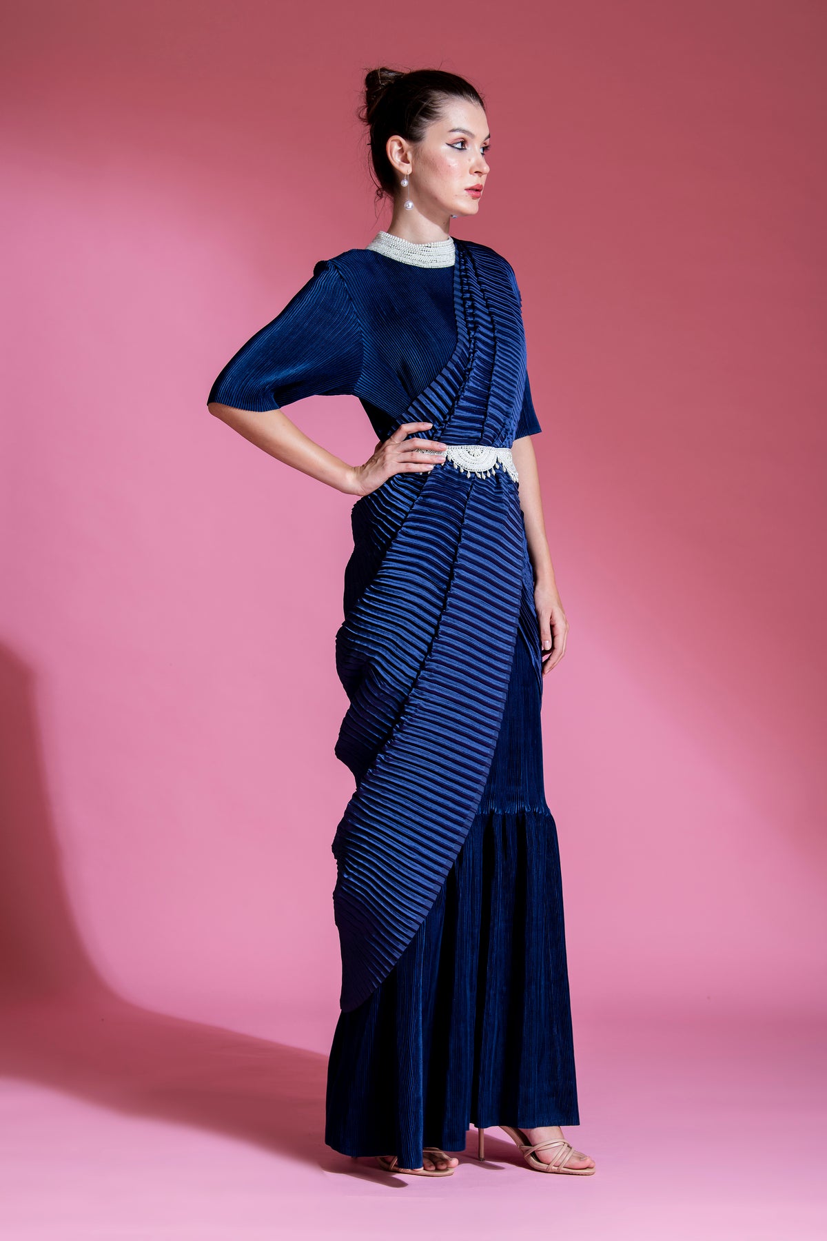* Indico Blue Satin small pleated saree, with Big Pleated Pallu with Pearl  Handwork on Collar with belt.