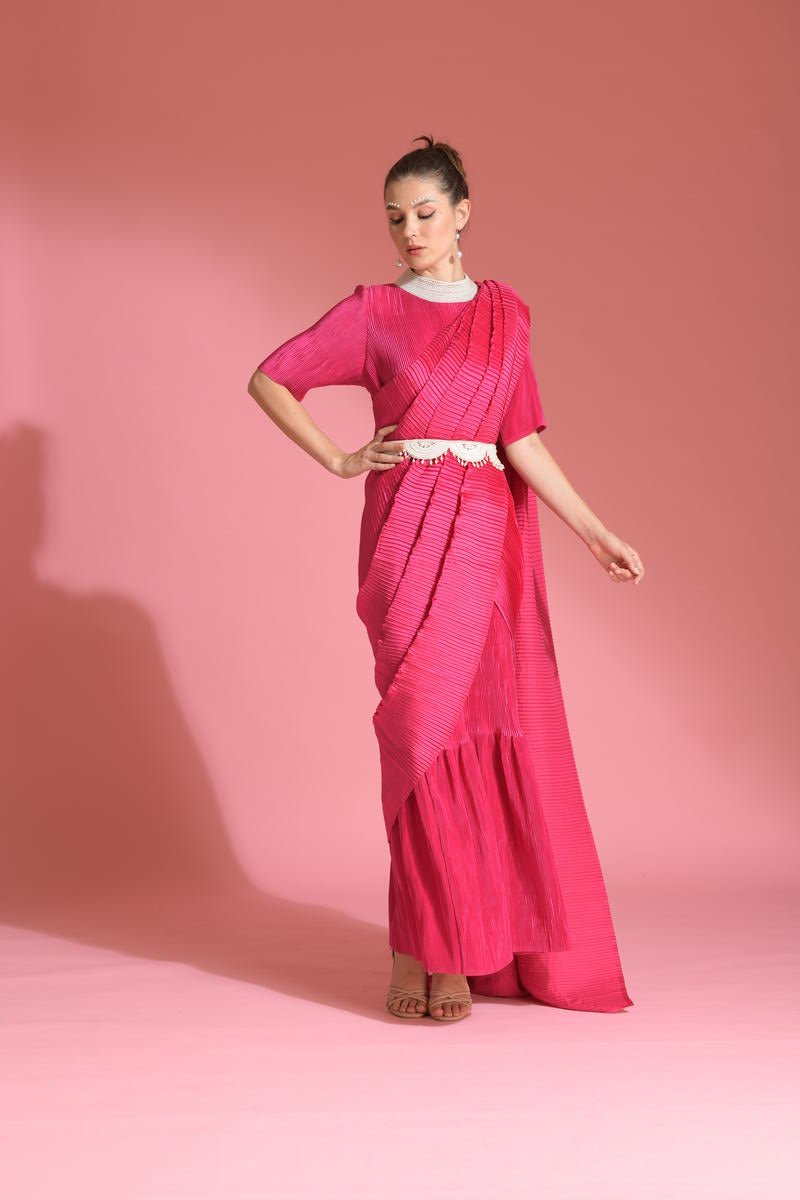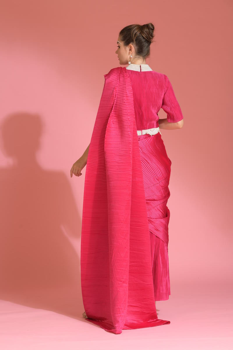 HOT PINK SAREE EMBRODED NECK BLOUSE WITH BELT